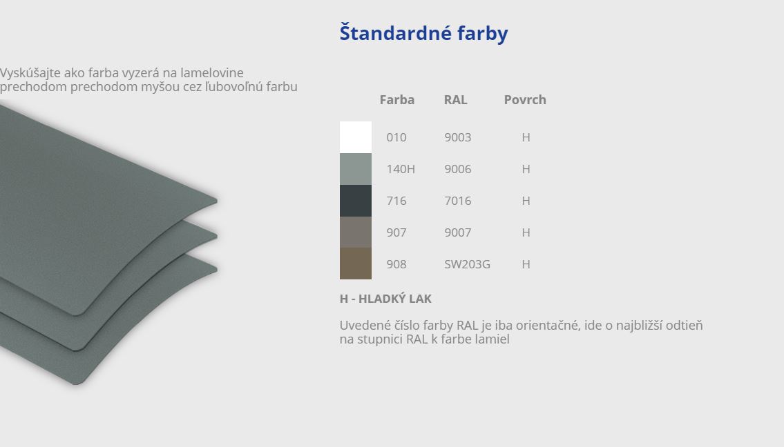 (na prianie zákazníka už možno dodať lamely bez zalakovaných hrán aj vo farbách: 010B – biela, 716B – antracitová, 907B – strieborná šedá, 908B – bronzová, ktoré sú taktiež skladom)